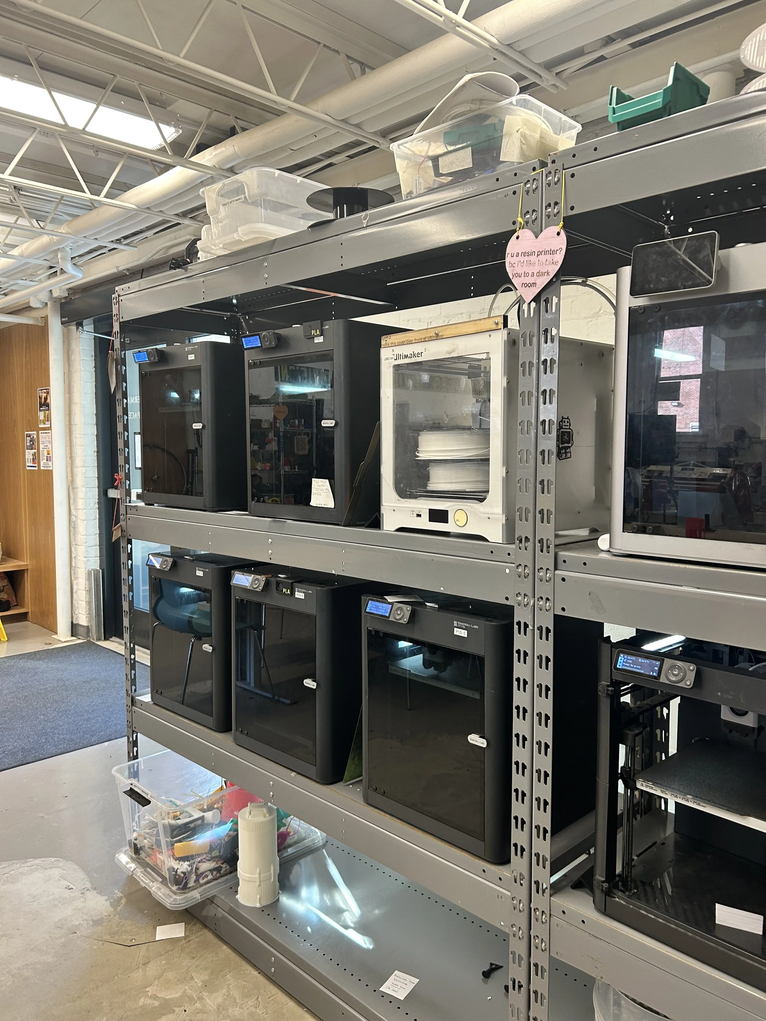 Our array of Bambu 3D printers. I spend a lot of time helping people print on these, as well as troubleshooting errors.